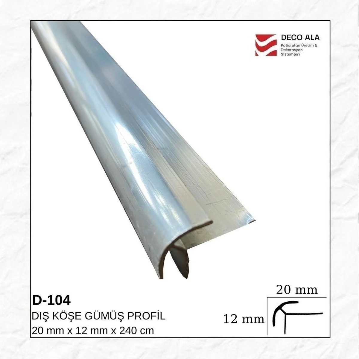 Bitiş Köşe Gümüş, seramik, fayans ve zemin kaplamalarında kenar bitişlerinde estetik ve şık bir görünüm sağlamak için kullanılan alüminyum profildir. Gümüş rengi sayesinde modern dekorasyonlarla uyum sağlar, aynı zamanda köşeleri darbelere karşı korur. Dayanıklı yapısı ile uzun ömürlü kullanım sunar ve uygulandığı yüzeylere dekoratif bir değer katar.